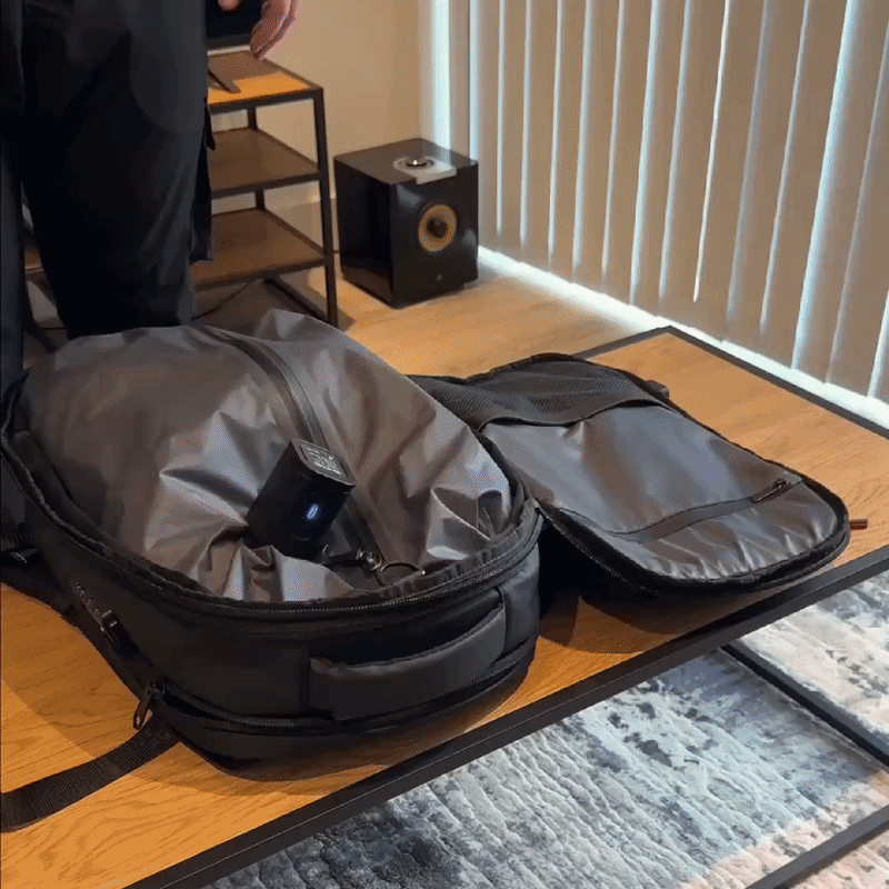 Det var då han upptäckte konceptet med en vakuumkomprimerad ryggsäck – ett system som komprimerar kläderna inuti och minskar volymen utan att öka väskans yttre storlek.