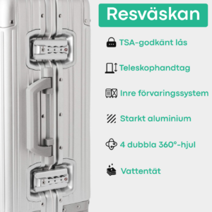 Jag har använt den här resväskan på tre resor nu och den har varit fantastisk. Hjulen är otroligt smidiga, jag kan skjuta den med ett finger. Aluminiumskalet känns stabilt och säkert, och TSA-låsen klickar fast utan problem vid säkerhetskontrollen. Bra pris. Tack.