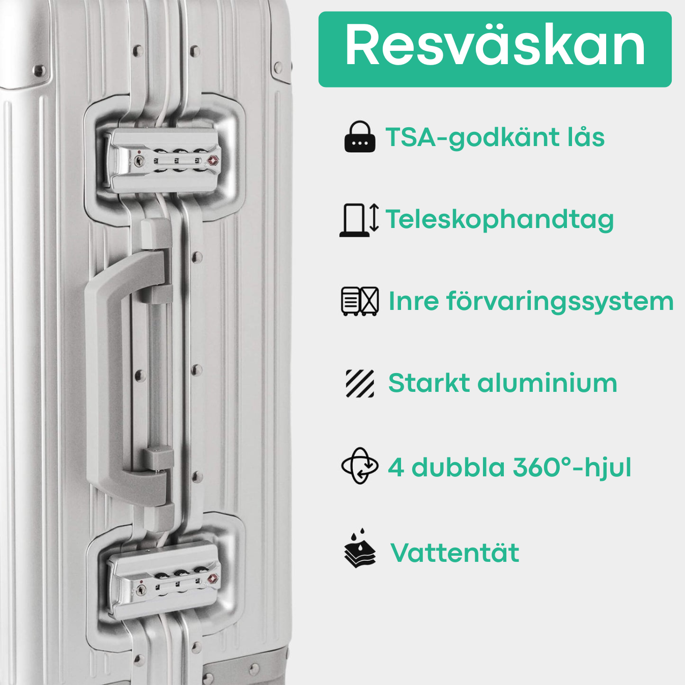 Ja – ännu säkrare. Dragkedjor är en av de vanligaste svaga punkterna på resväskor, och de kan öppnas med något så litet som en penna. Våra dubbla TSA-godkända kombinationslås eliminerar den risken helt. De är inbyggda i den förstärkta aluminiumramen, så du får maximalt skydd och sinnesro när du flyger internationellt.